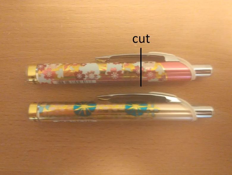 - Cut Dr. Grip grip in half and place both grips on the two Energel barrels.