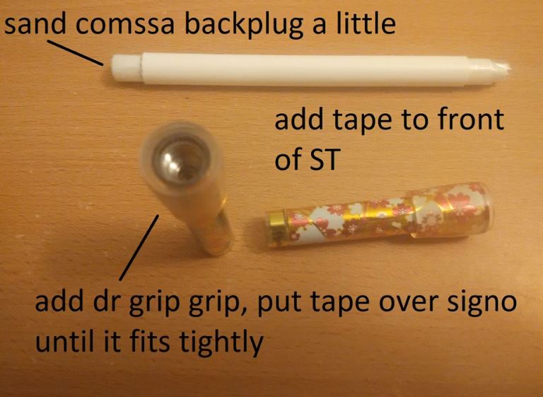 - Put tape over Signo tips until it fits snugly and inversely place the tips inside the Dr Grip grips.