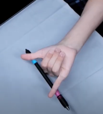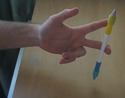 During a (finger)hold, the pen is hold steady just by one finger, in a position that usually requires unusual flexibility. For example, in a middlehold, the pen is held between 2z and 2y, while locking the 1st interphalangeal joint (2xy). This is usually done in palm side or palm down to emphasize the fact that the pen is actually held by the finger and it’s not just balanced over it.