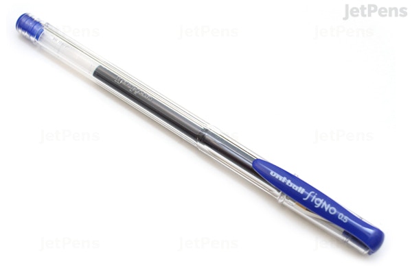 A gripless gel pen with a clear barrel. Similar to the gripless Pilot G1 variants, with a small cap. Has a standard Signo tip.
