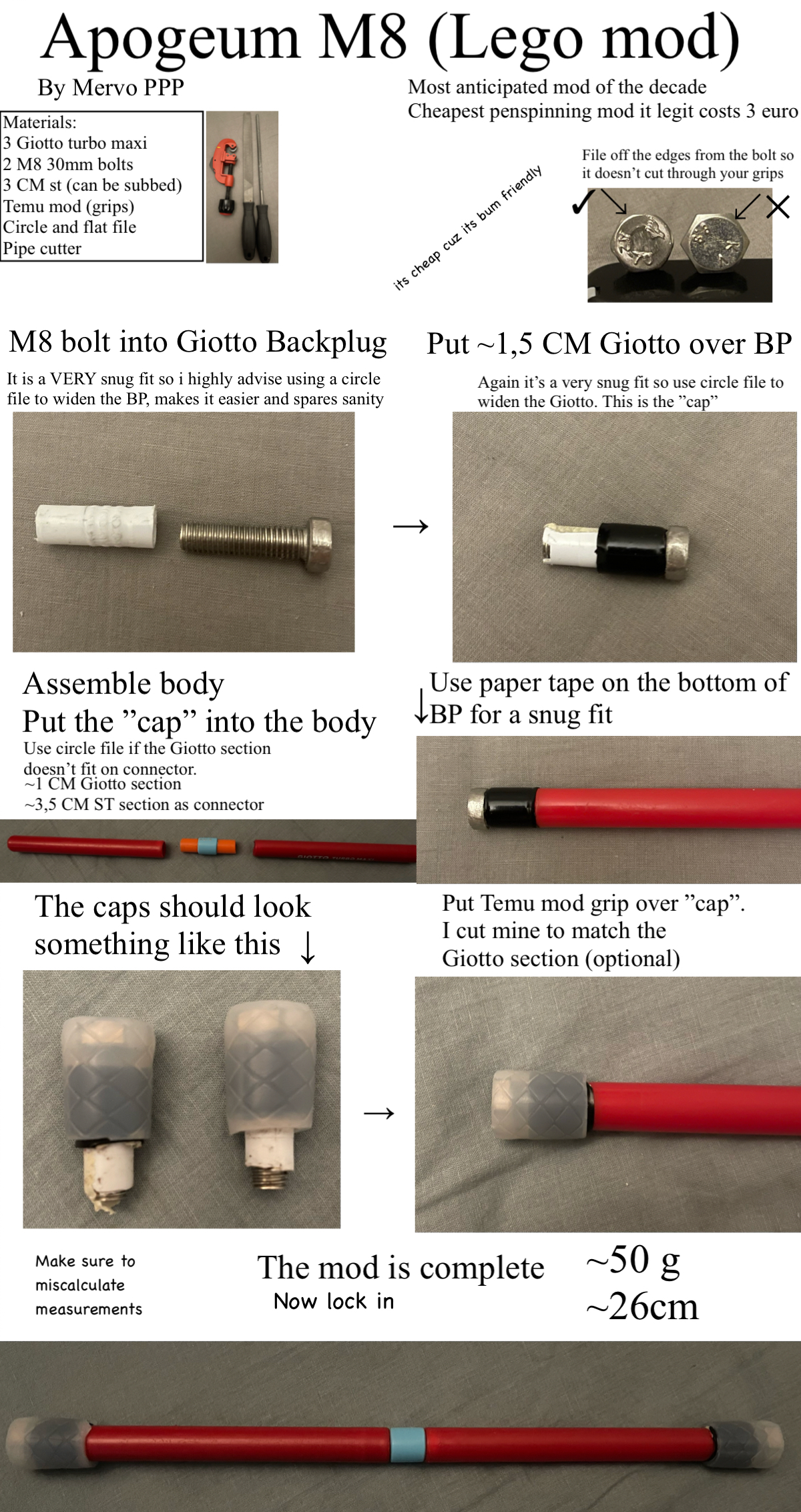 Apogeum M8 (also known as The Lego Mod) is an bolt tipped mod made by Polish PPP based spinner Mervo in 2024. The mod is the 6th iteration since the original in 2019. The mod is extremely cheap to make since it uses parts sourced from Temu excluding the Giotto Turbo Maxi , it also uses bolts as tips. The cost of the mod is ~4€ price could vary depending on the price of the Giotto Turbo Maxi.